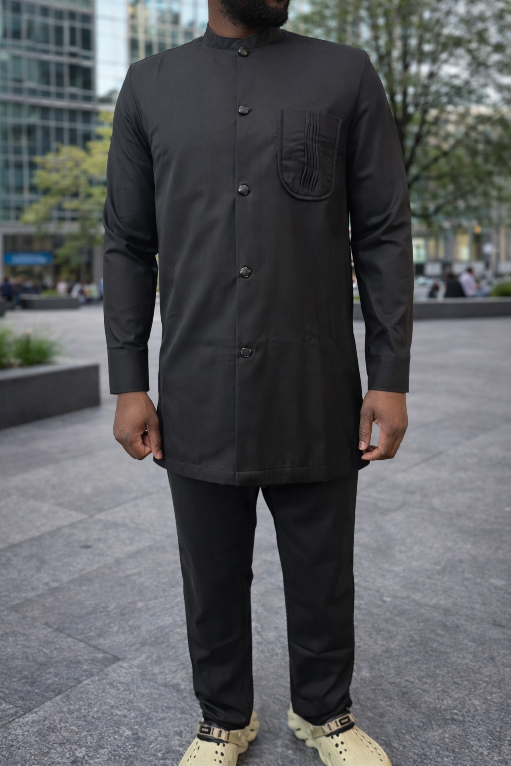 Le Djambar est une déclaration de style à lui seul. Pour un look "Stealth Luxe" (luxe discret), portez-le avec des mocassins noirs vernis ou des bottines en cuir. C'est la tenue idéale pour les soirées où vous souhaitez allier confort et charisme sombre.
