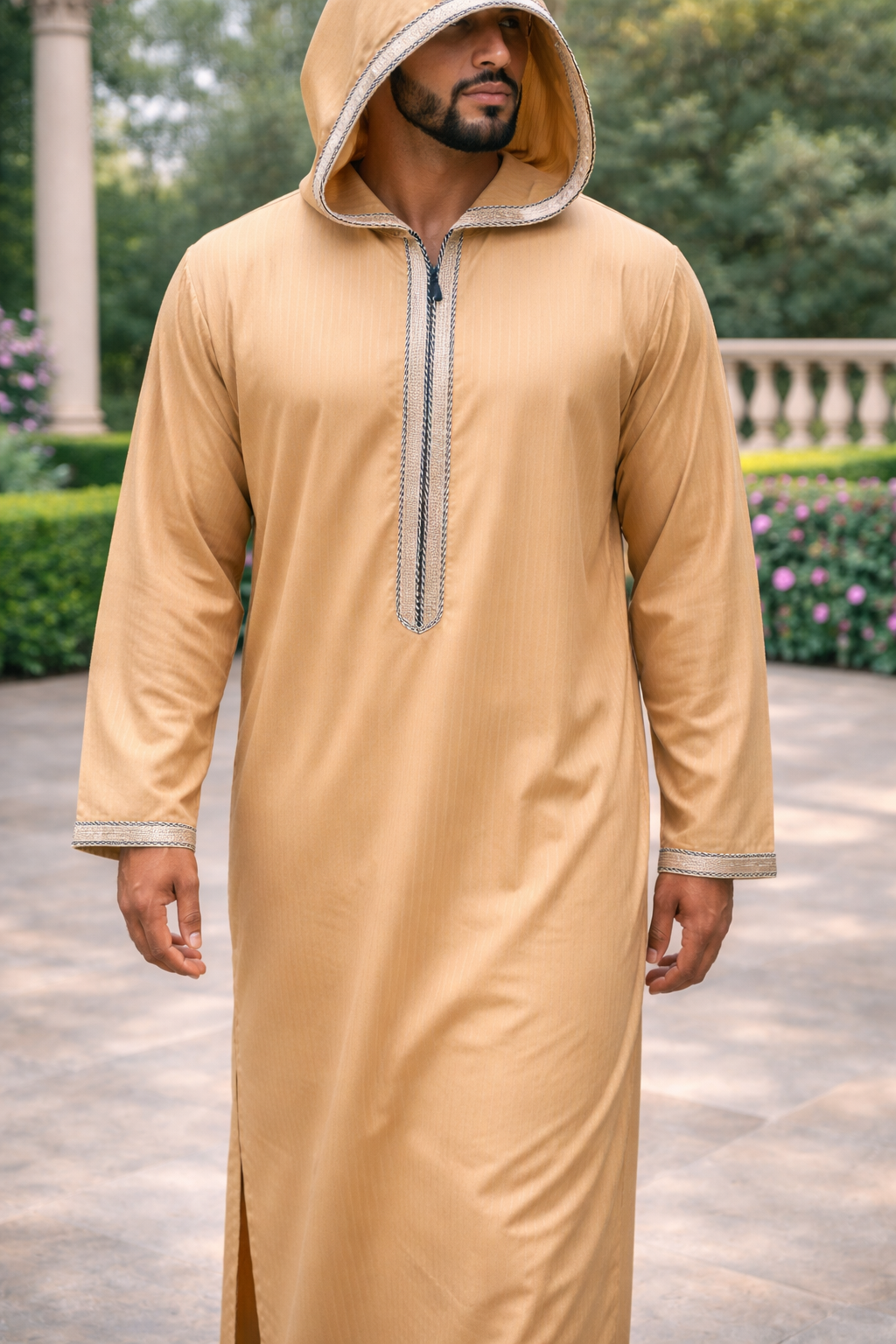 Retrouvez vos racines avec la Djellaba Nomade. Pièce emblématique du vestiaire masculin traditionnel, elle est ici sublimée par des finitions artisanales de haute volée. Avec sa capuche signature et sa coupe fluide, elle incarne l'élégance décontractée de l'homme libre, ancré dans ses valeurs.