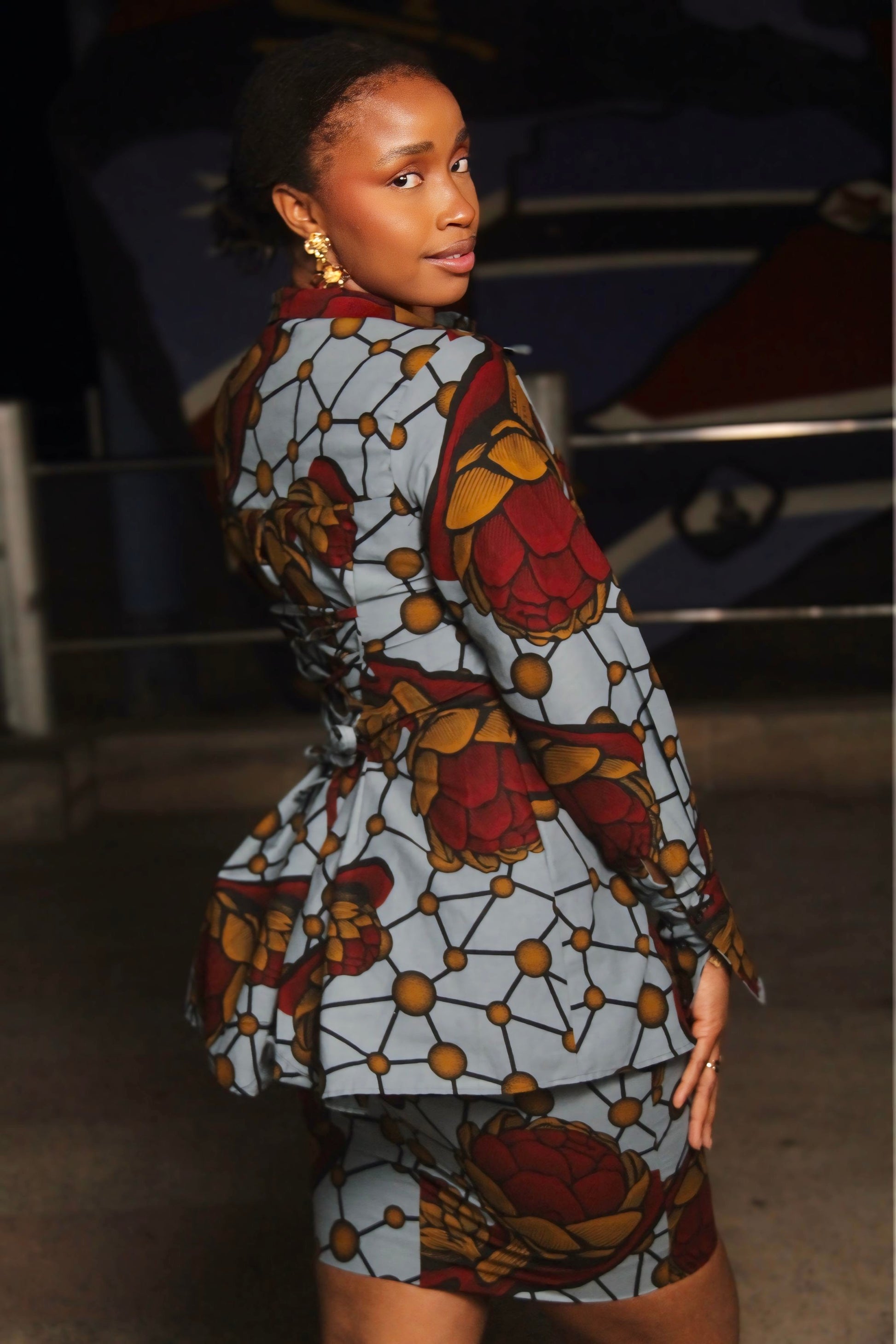 Confectionné dans un tissu wax de haute qualité, cet ensemble offre des couleurs vibrantes et des motifs uniques qui subliment toutes les silhouettes.