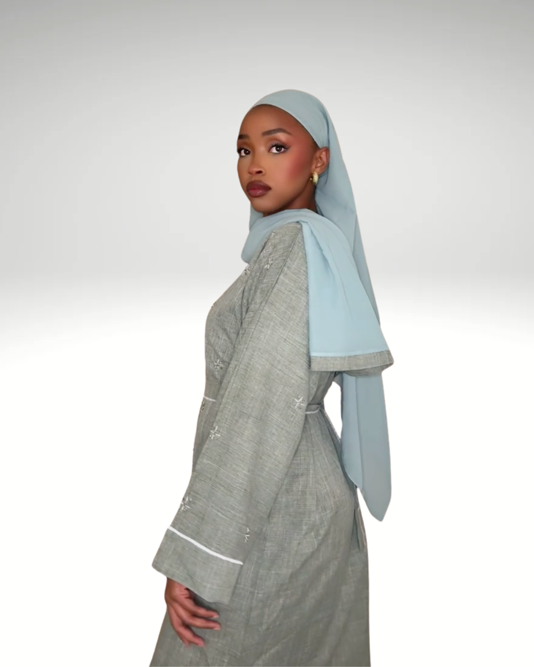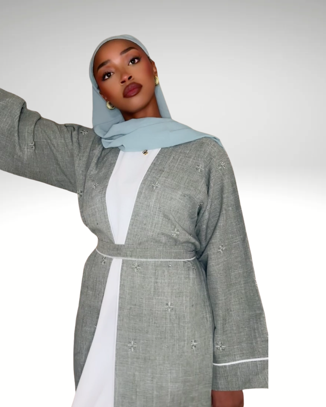 L'ensemble Nayla se distingue par son jeu de contrastes entre les textures et les couleurs. Pour une allure sophistiquée, portez-le avec des accessoires minimalistes argentés qui rappelleront la modernité de son gris texturé. C'est la tenue parfaite pour celles qui cherchent à allier pudeur et prestige.
