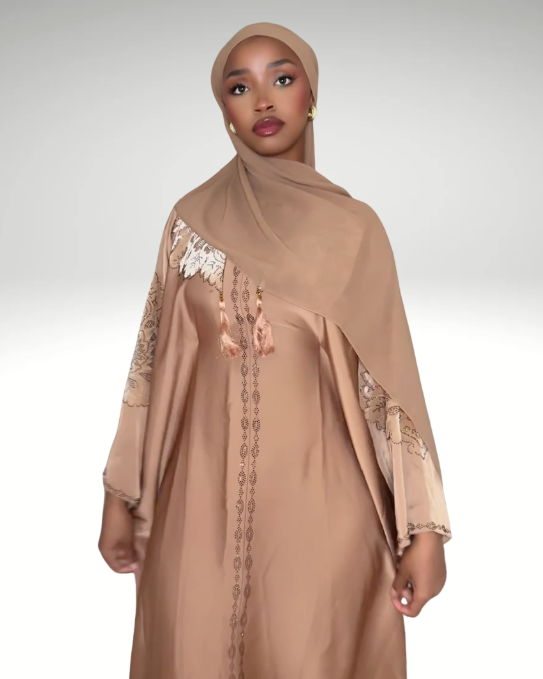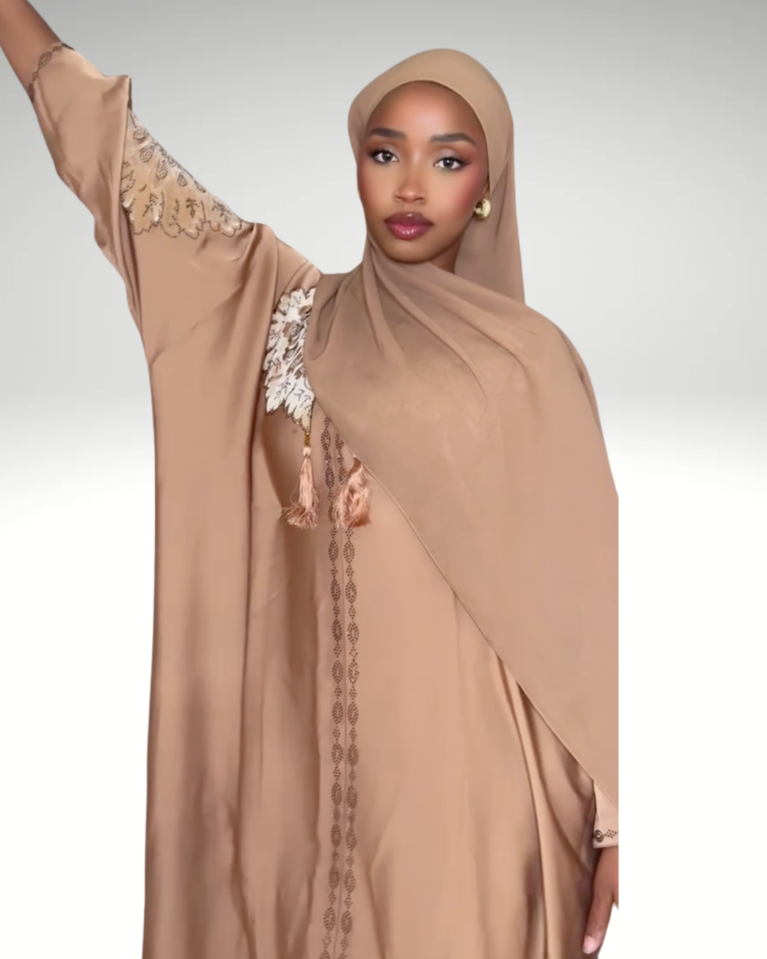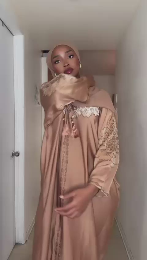 L'ensemble Nayla se distingue par son jeu de contrastes entre les textures et les couleurs. Pour une allure sophistiquée, portez-le avec des accessoires minimalistes argentés qui rappelleront la modernité de son gris texturé. C'est la tenue parfaite pour celles qui cherchent à allier pudeur et prestige.